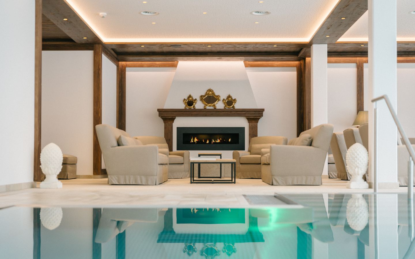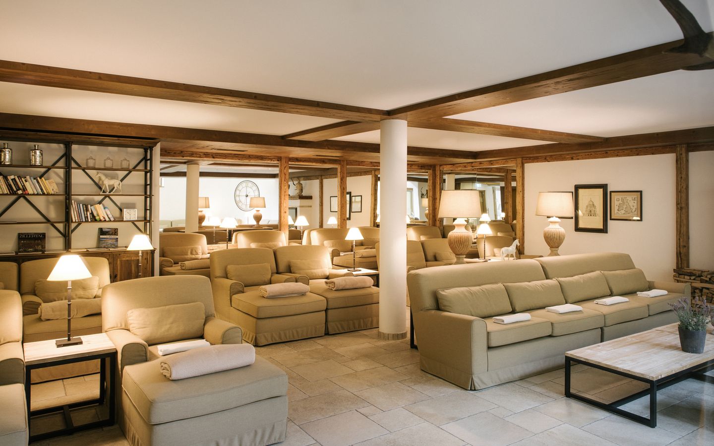 - 150 m² großer Relax- und Ruhebereich mit offenem Kamin und Luxussofas zum Entspannen
